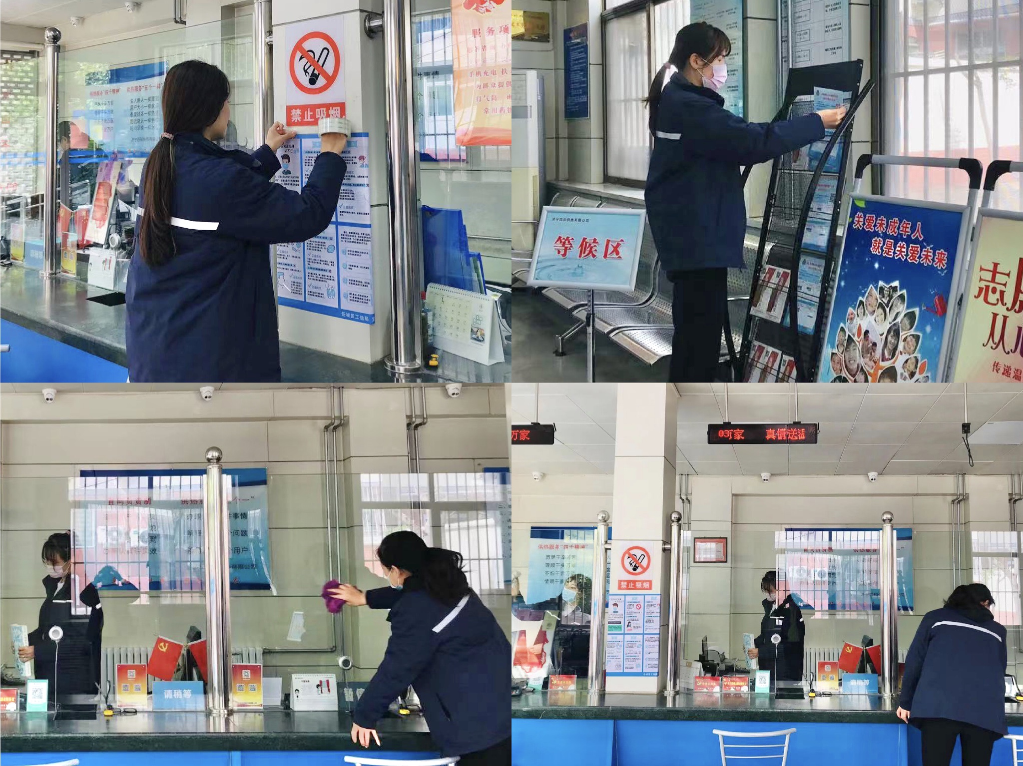 為認真落實市委、市政府關于“創(chuàng)城”各項工作安排和部署,進一步鞏固提升濟寧市創(chuàng)衛(wèi)成果,確保窗口單位營業(yè)網(wǎng)點創(chuàng)城任務全面落實。近日,濟寧四和供熱有限公司各營業(yè)廳陸續(xù)開展衛(wèi)生清掃工作,切實做好日常保潔、落實門前三包責任,為濟寧市迎接國家衛(wèi)生城市復審貢獻四和力量。