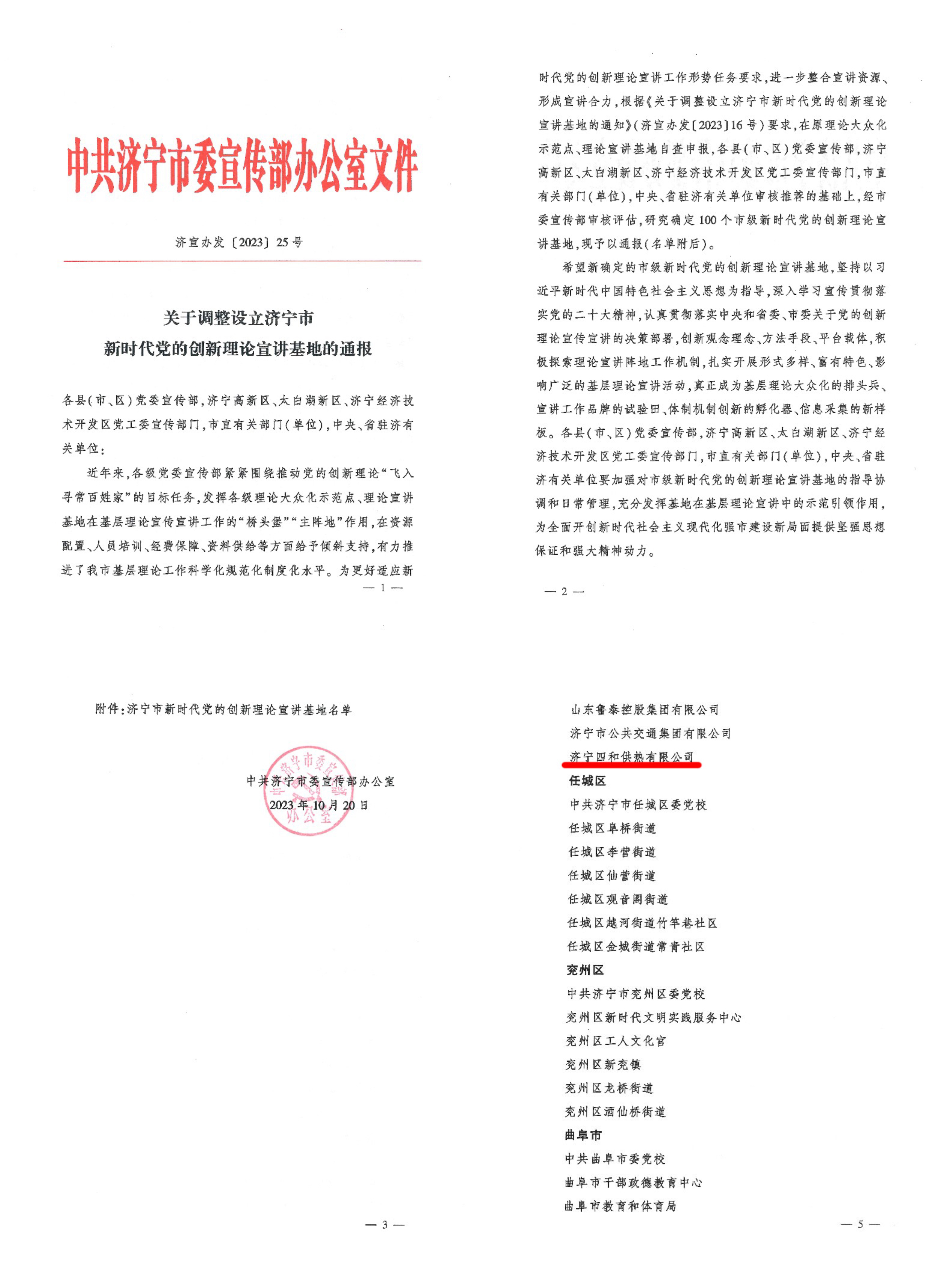 濟(jì)寧四和供熱有限公司獲評 “濟(jì)寧市新時代黨的創(chuàng)新理論宣講基地”